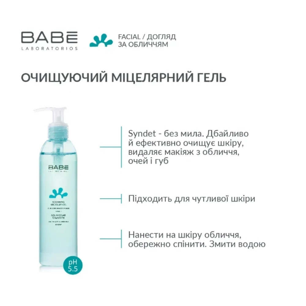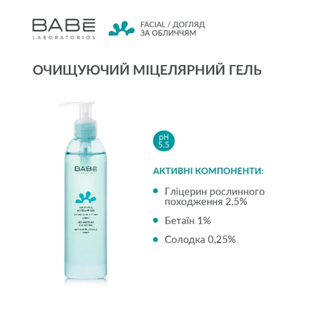 Babe Laboratorios (Бабе Лабораторіос) Міцелярний гель 90 мл — ніжний засіб для щоденного очищення обличчя, який поєднує ефективність міцелярної технології та делікатну дію гелю. Він м’яко видаляє забруднення, надлишок себуму та залишки макіяжу, не порушуючи природний баланс шкіри.