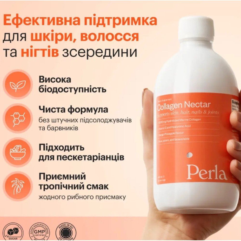 Collagen Nectar від Perla Helsa — це інноваційна рідка добавка з високоякісним морським колагеном, розроблена для підтримки здоров’я шкіри, волосся, нігтів, суглобів та зв’язок. Завдяки високій концентрації гідролізованого колагену та комплексу вітамінів, засіб ефективно стимулює природні процеси регенерації й омолодження.