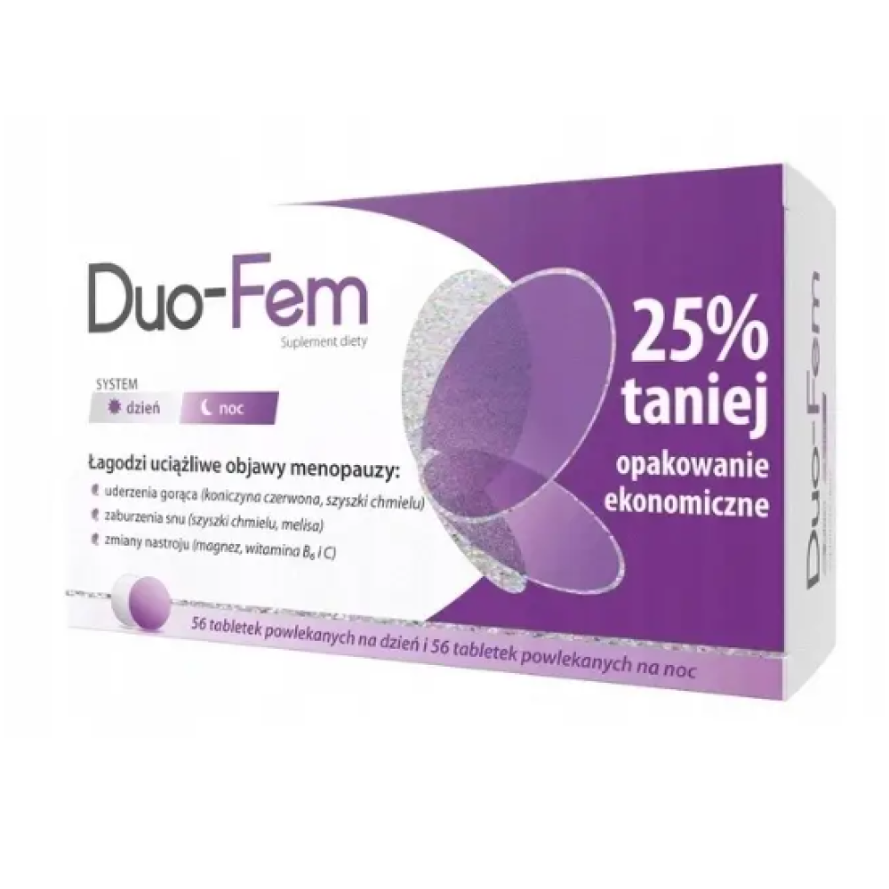 Duo-Fem — дієтична добавка для жінок у період менопаузи та клімаксу. Формула розділена на денні та нічні таблетки, що дозволяє адаптувати прийом активних компонентів до циркадного ритму організму та підтримувати комфорт протягом усього дня і ночі.