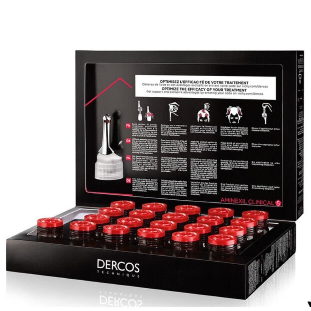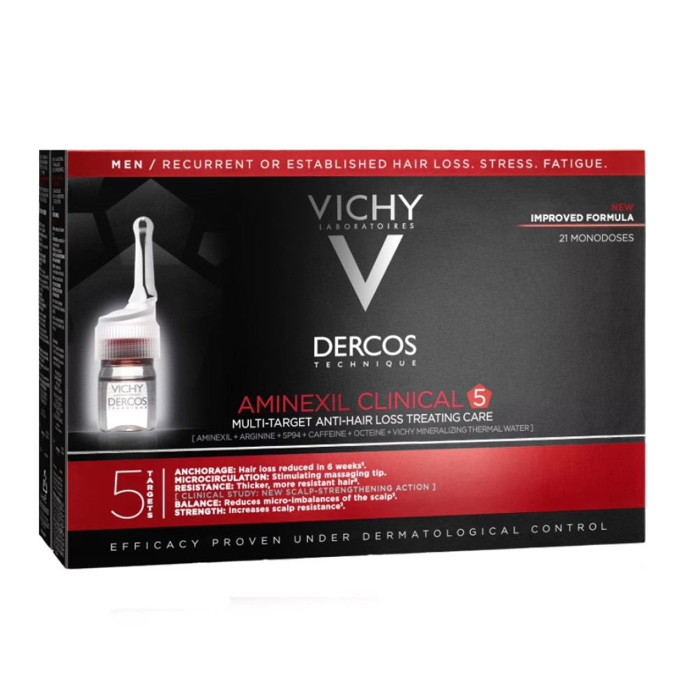 Dercos Aminexil Clinical 5 – це комплексний засіб у ампулах, розроблений спеціально для чоловіків. Призначений для лікування рецидивуючого або хронічного випадіння волосся, викликаного стресом чи дієтою, а також рекомендований при постійному випадінні волосся.