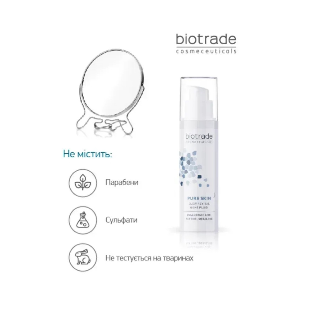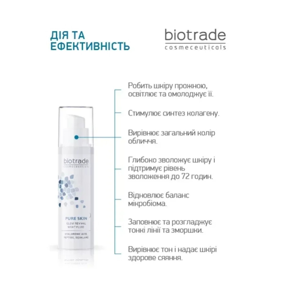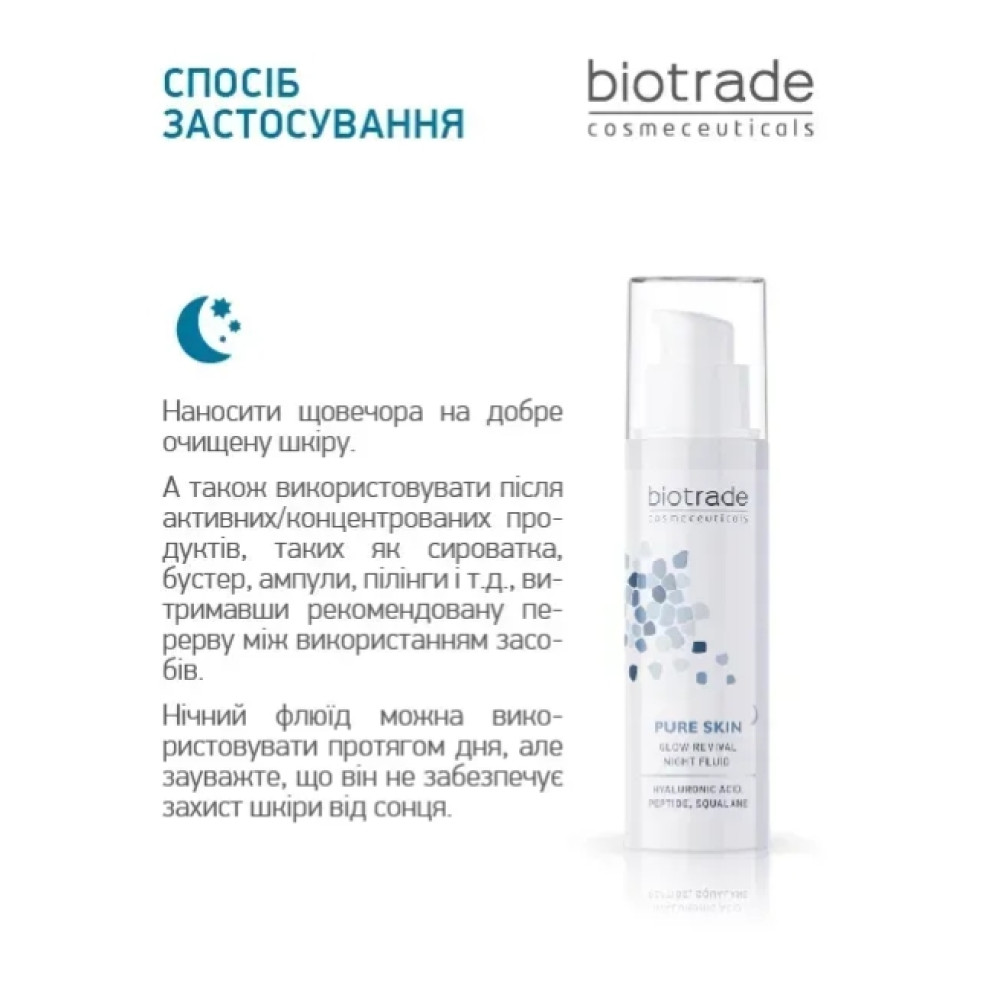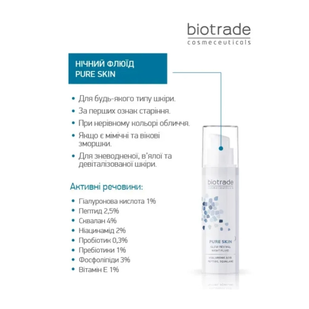 Нічний флюїд серії PURE SKIN від бренду дерматологічної косметики BIOTRADE - це мультифункціональний засіб, що піклується про вашу шкіру вночі, аби вона завжди сяяла красою та здоров’ям. Рекомендується для будь-якого типу шкіри, при перших ознаках старіння та для зменшення ліній існуючих зморшок і покращення пружності шкіри, а також для зневодненої, втомленої та в’ялої шкіри, аби відновити колір обличчя та здорове сяяння шкіри.