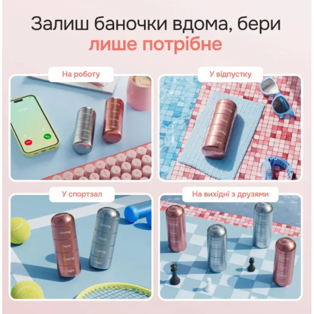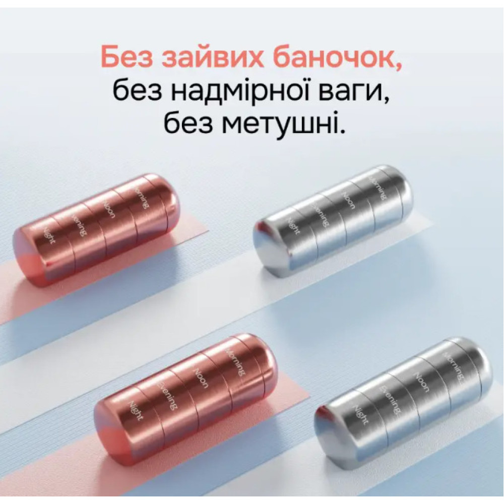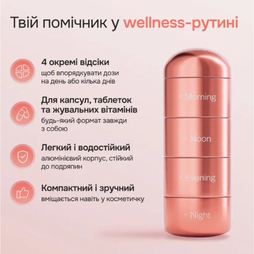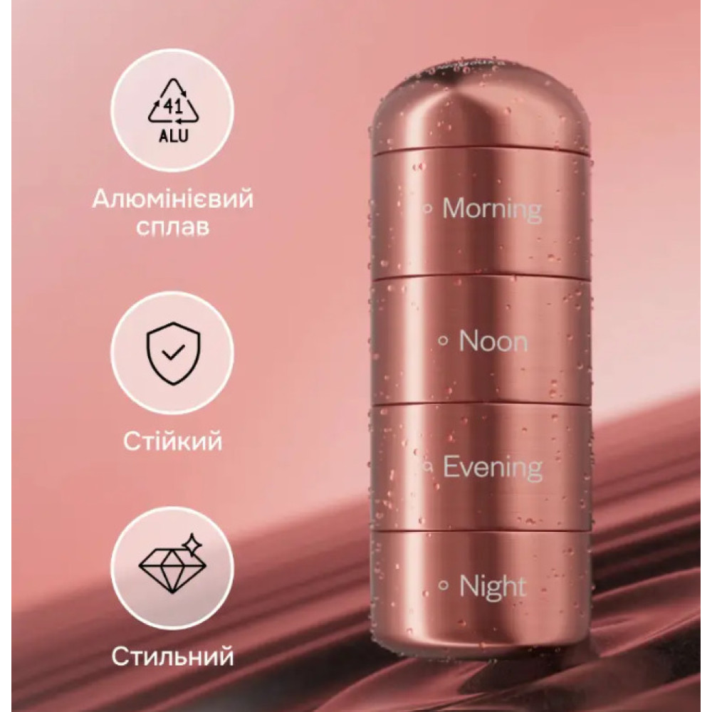 Стильний і компактний органайзер для таблеток і харчових добавок. Завдяки 4 окремим відсікам, ви завжди маєте свої добавки під рукою та можете зручно планувати щоденний прийом. Алюмінієвий корпус додає міцності та преміального вигляду.