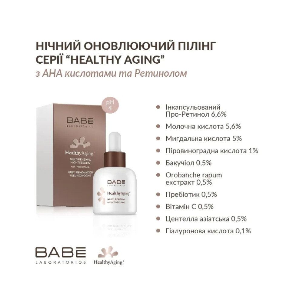 Нічний оновлюючий пілінг з AHA кислотами та Ретинолом серії HEALTHY AGING від іспанського бренду BABE LABORATORIOS - це регенеруюча сироватка, збагачена альфа-гідроксикислотами (AHA) та інкапсульованим Про-Ретинолом для омолодження та оновлення шкіри.