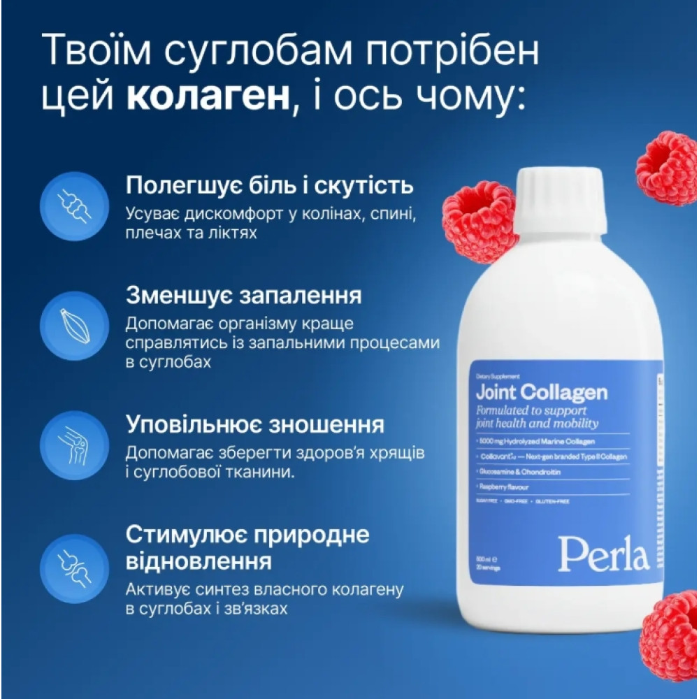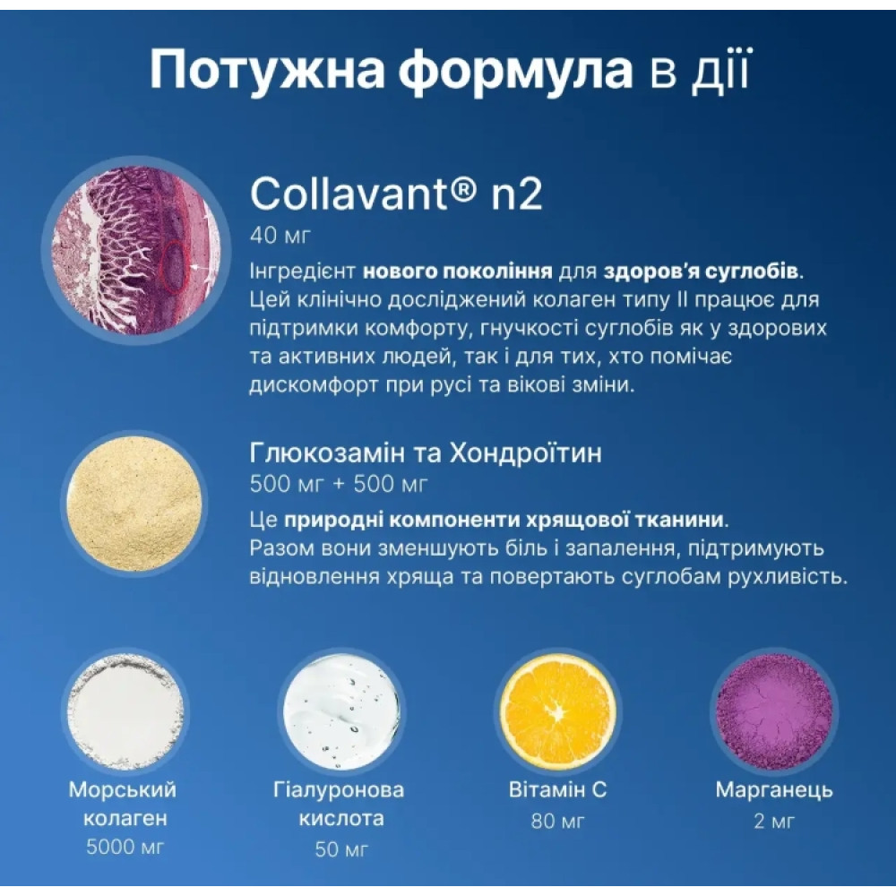 - Стимулює природний синтез колагену в суглобах і зв’язках