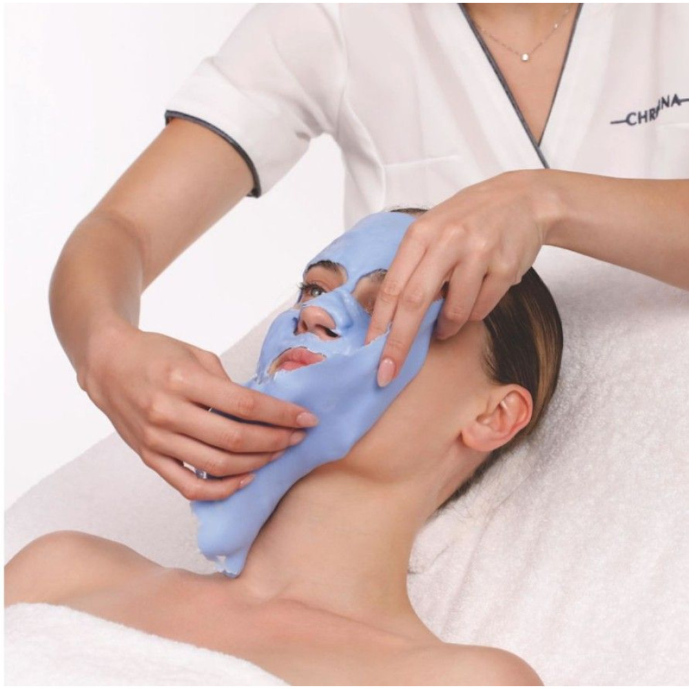Смешайте 15 г порошка маски с постепенным добавлением 60 мл холодной воды до получения густой однородной консистенции. С помощью спатулы нанесите щедру количество средства на лицо, шею и рот. По желанию клиента прикройте глаза и брови влажной марлей и нанесите маску сверху. Оставьте до полного высыхания примерно на 10 минут. Аккуратно снимите по направлению от шеи и вверх. Чтобы снять маску одним полотном, смочите руки и проведите по маске. Удалите остатки влажной салфеткой или губкой. Просушите кожу с помощью салфетки.