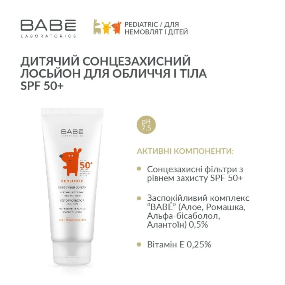Содержит успокаивающий комплекс BABE на основе Алоэ и Ромашки, благодаря чему не только защищает кожу от солнечных лучей, но и оказывает успокаивающее и увлажняющее действие. Лосьон водостойкий.