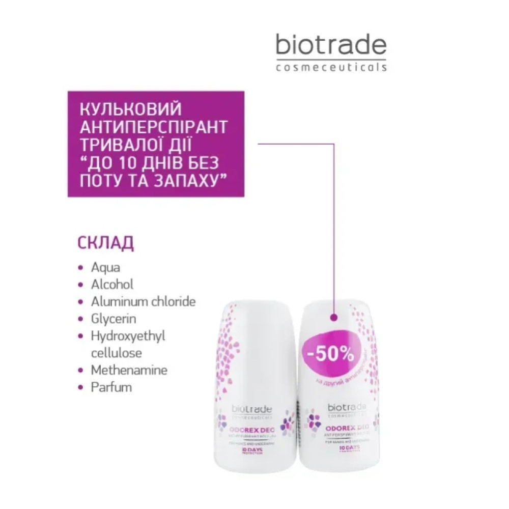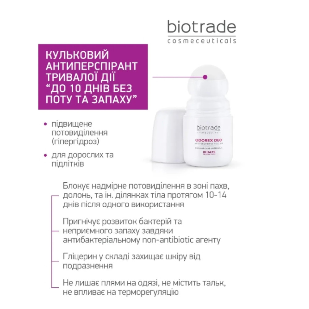 Шариковый антиперспирант длительного действия для зоны подмышками, для ладоней и других участков тела. Эффективен при повышенной потливости. Предупреждает возникновение неприятного запаха, дарит уверенность в движениях и значительно уменьшает потливость на период от 10 до 14 дней. Не нарушает терморегуляцию и не оставляет белые пятна на одежде.
