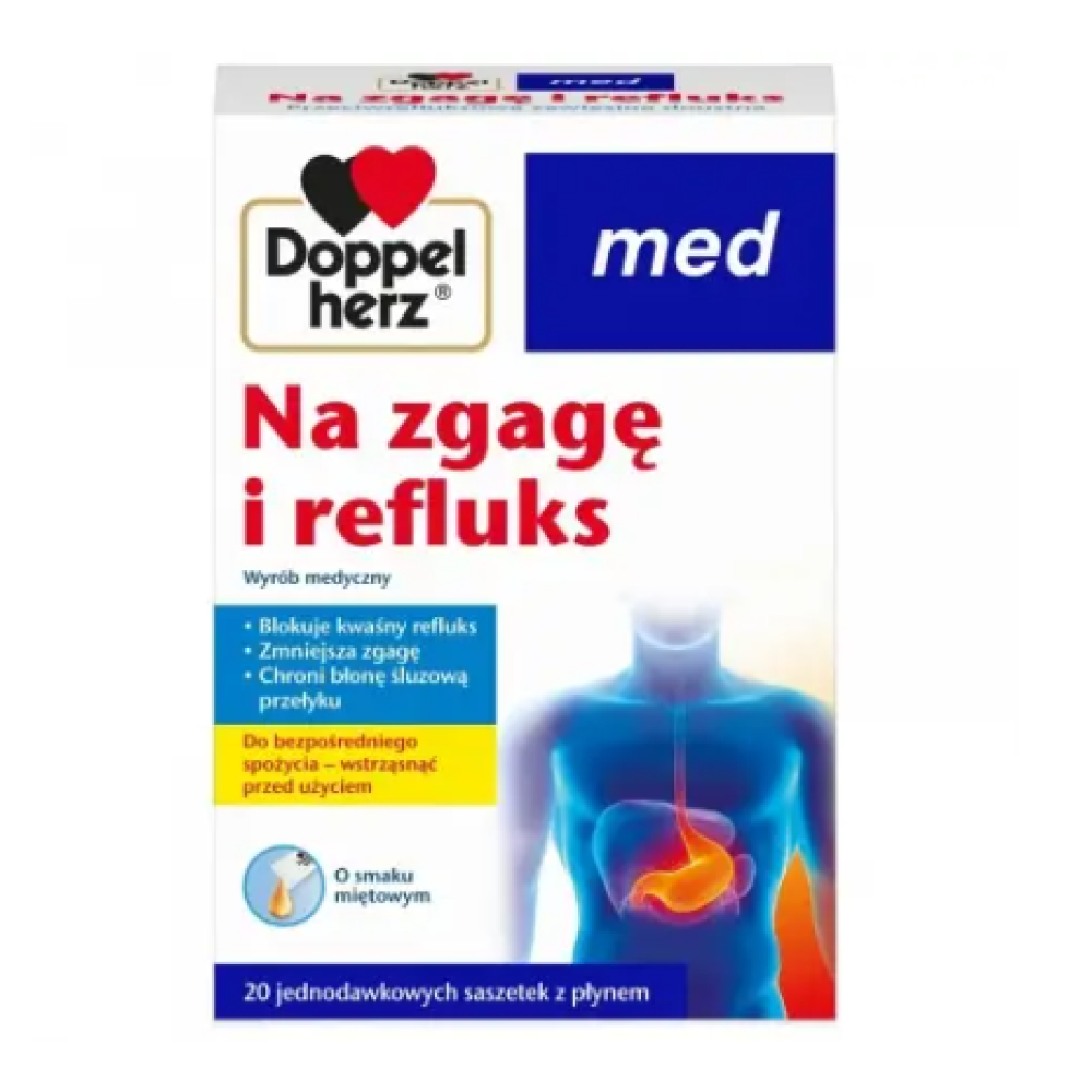 Что такое Доппельгерц Мед Печия и Рефлюкс 20 пакетиков? Это медицинское изделие показано для лечения гастроэзофагеального рефлюкса с целью уменьшения сопутствующих симптомов, таких как печень, печень во время беременности, рефлюкс-эзофагит, кислотное отрыгивания, расстройства пищеварения, симптомы ночного рефлюкса, кашель, ларингит и фарингит.