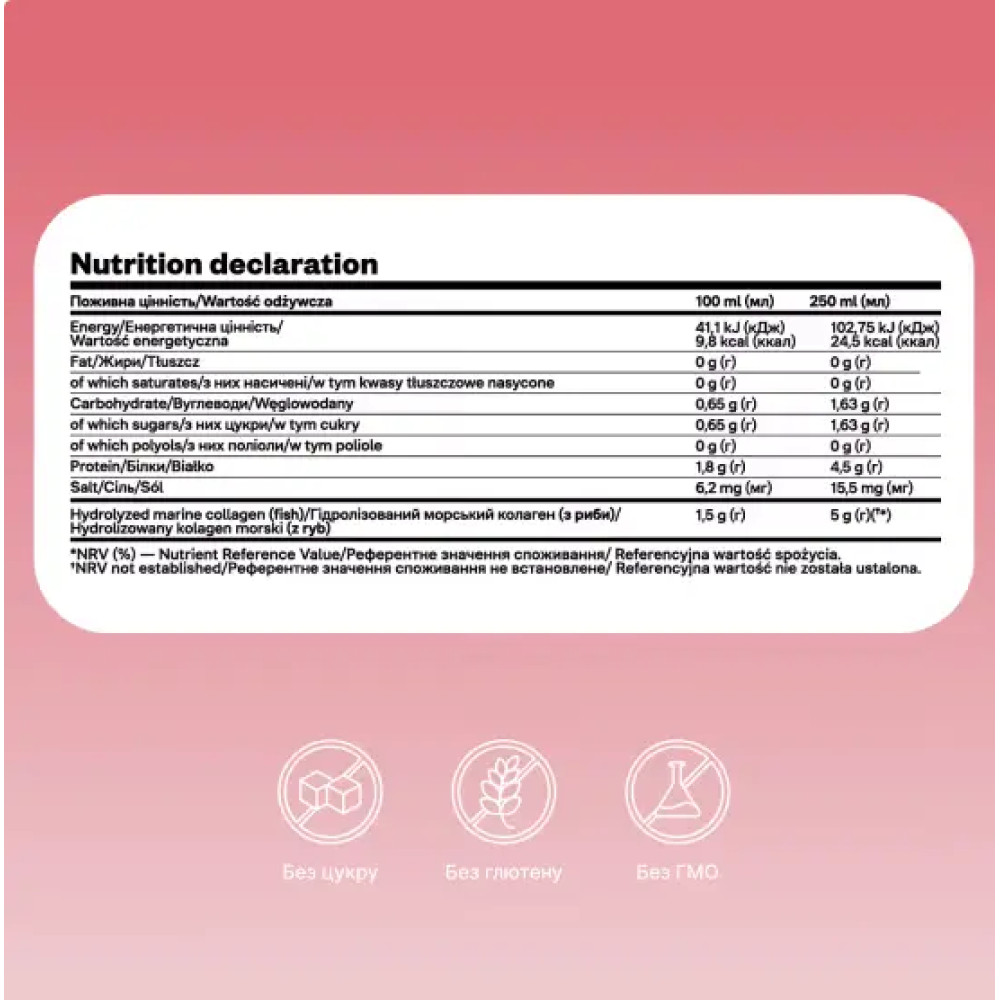 Содержит аллергены морской (рыбной) коллаген. БЕЗ ГМО. Содержит природные сахара. Допускается естественный осадок, обусловленный использованным сырьем.
