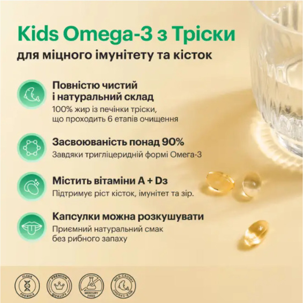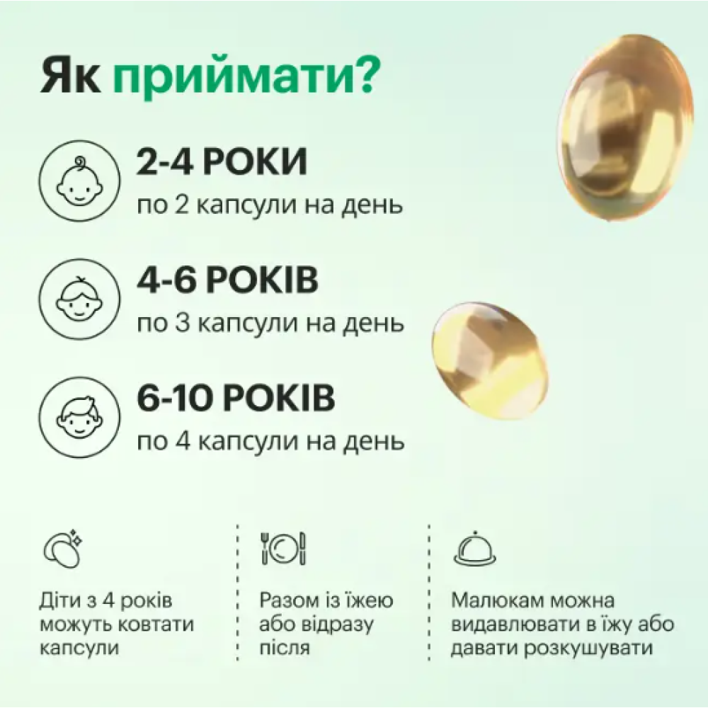 Базовая поддержка здорового роста и развития твоего ребенка. Мы специально создали мягкие и маленькие капсулки, чтобы малышам было удобнее принимать. Кстати, можешь давать раскусывать их - они приятны по вкусу, как икрынки.
