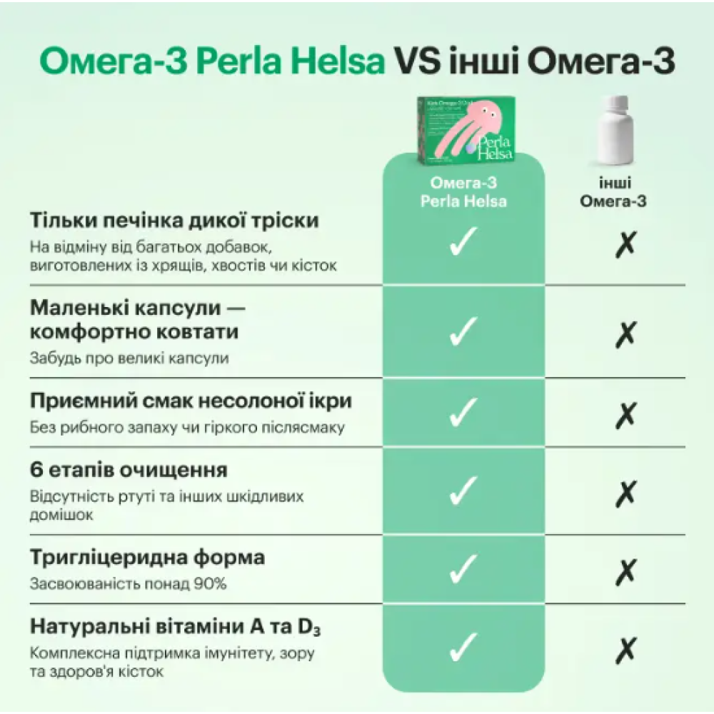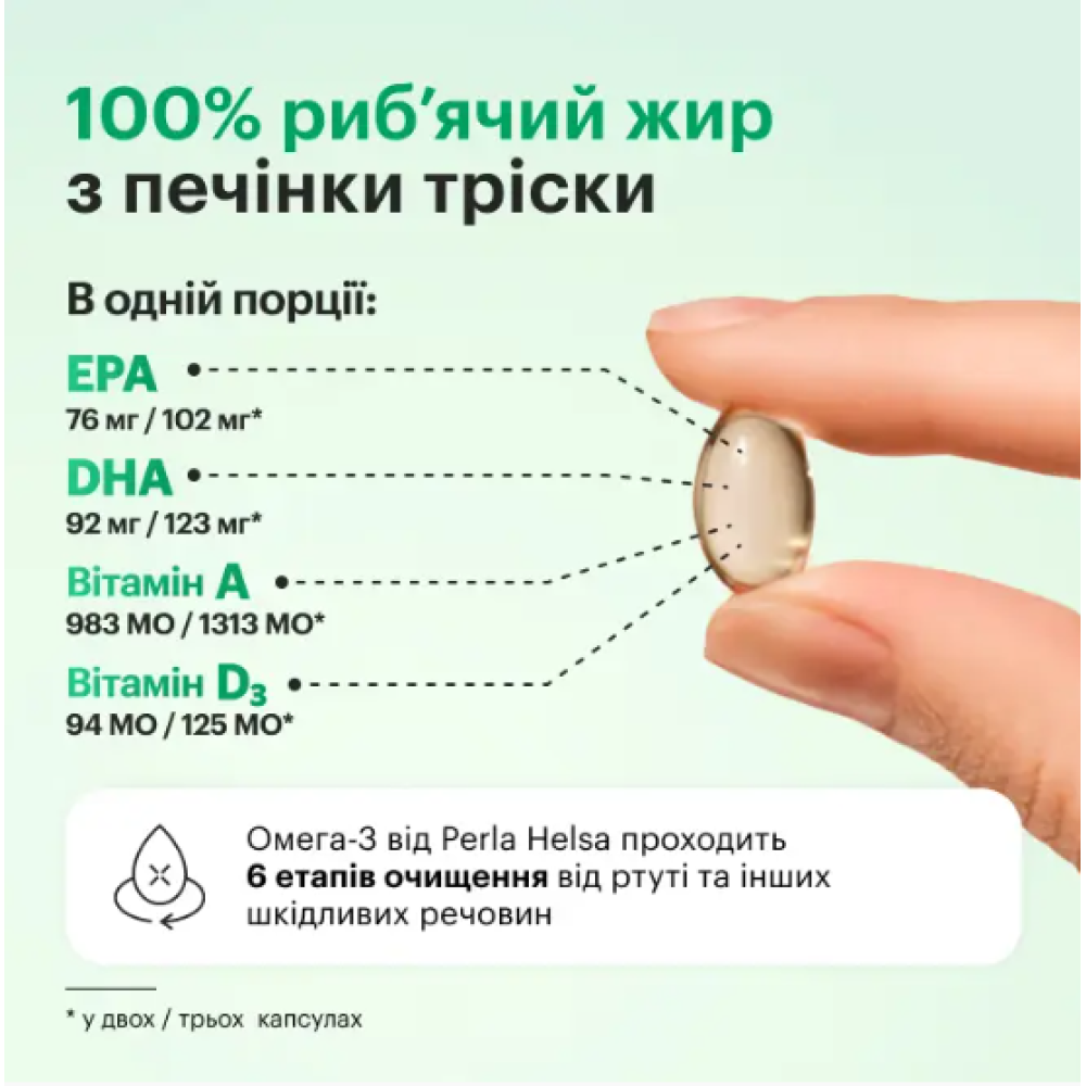 - 100% рыбий жир из печени трески (Исландия), желатин (Германия), глицерин (Чехия)