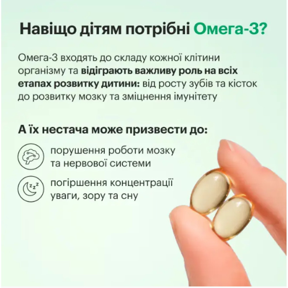 Благодаря сочетанию EPA и DHA кислот, а также натуральных витаминов A и Dз, Омега-3 поддерживают развитие когнитивных способностей, памяти, органов зрения, иммунитета, правильного роста костей и мышц.