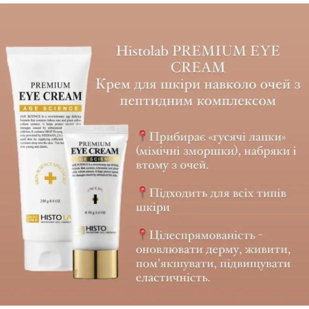 Histolab Age Science Premium Eye Cream Крем для кожи вокруг глаз с пептидным комплексом предназначен для устранения явно выраженных возрастных изменений с нежных, чувствительных участков вокруг глаз. Подойдет для всех видов эпидермиса, имеющих явные признаки увядания/старения.