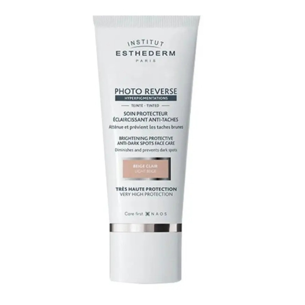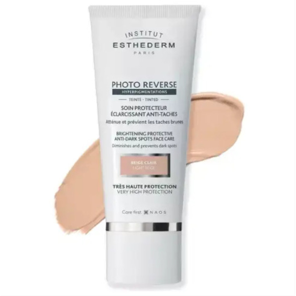 Первое средство, способное осветлить кожу даже во время загара. Защитный тонирующий крем против пигментных пятен Institut Esthederm Photo Reverse Brightening Protective Anti-Dark Spots Face Care обеспечит вашему лицу высокую степень УФ-защиты, предотвращая негативное воздействие солнечного излучения. Кроме того, он уменьшает вероятность появления гиперпигментации, минимизирует видимость темных пятен, делает кожу сияющей и мягкой.