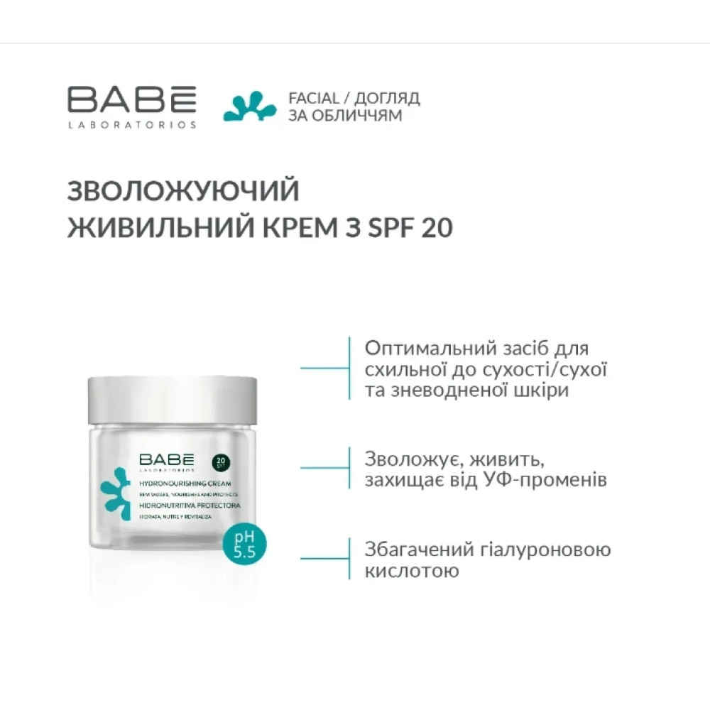 Увлажняющий питательный крем для лица с SPF 20 BABE Laboratorios для нормальной, склонной к сухости и сухой коже.
