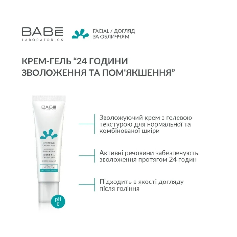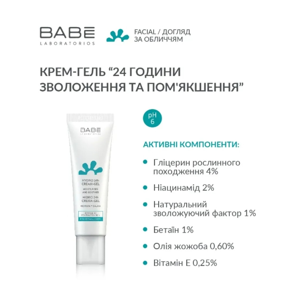 Крем-гель «24 часа увлажнения и смягчения» BABE LABORATORIOS. Крем-гель «24 часа увлажнения и смягчения» BABE LABORATORIOS обладает сверхлегкой текстурой, благодаря которой быстро поглощается кожей и не оставляет жирного блеска. Некомедогенная формула крема обогащена увлажняющими и смягчающими компонентами, которые обеспечивают необходимое увлажнение кожи в течение 24 часов. После нанесения, крем мгновенно обеспечивает чувство комфорта. Это идеальное средство для ежедневного ухода за кожей любого типа, особенно за нормальной и комбинированной.