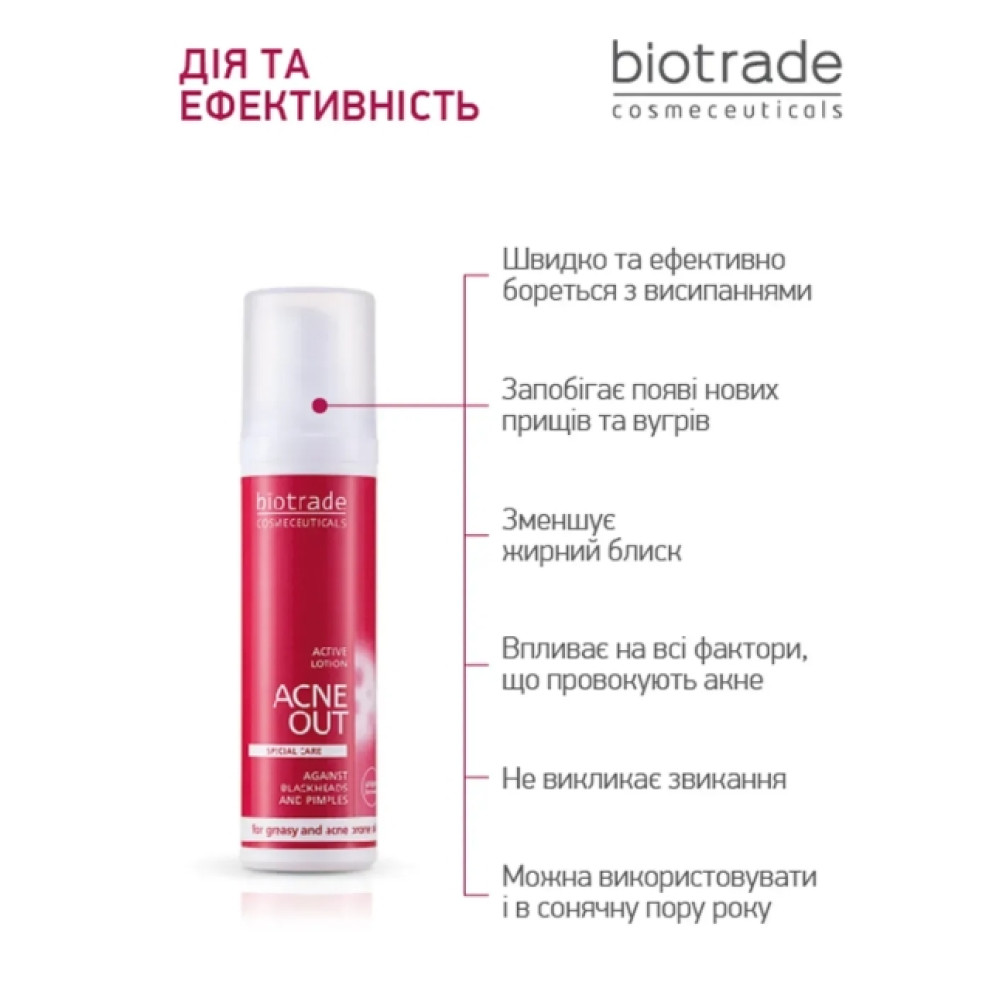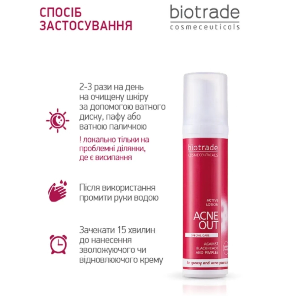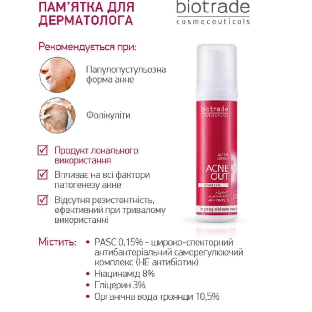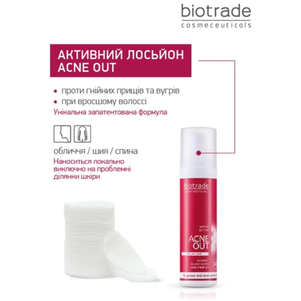 АКТИВНИЙ ЛОСЬЙОН ДЛЯ ПРОБЛЕМНОЇ ШКІРИ З ЗАПАЛЬНИМИ ФОРМАМИ АКНЕ ACNE OUT от бренда дерматологической косметики BIOTRADE предназначен для локального применения при жирной и проблемной коже, склонной к акне, с переявленными воспалительными папулами и пустылками на лице и теле. Видимый результат уже через 5 дней использования. Рекомендован дерматологами также для профилактики и в схеме терапии фолликулитов (вросших волос).