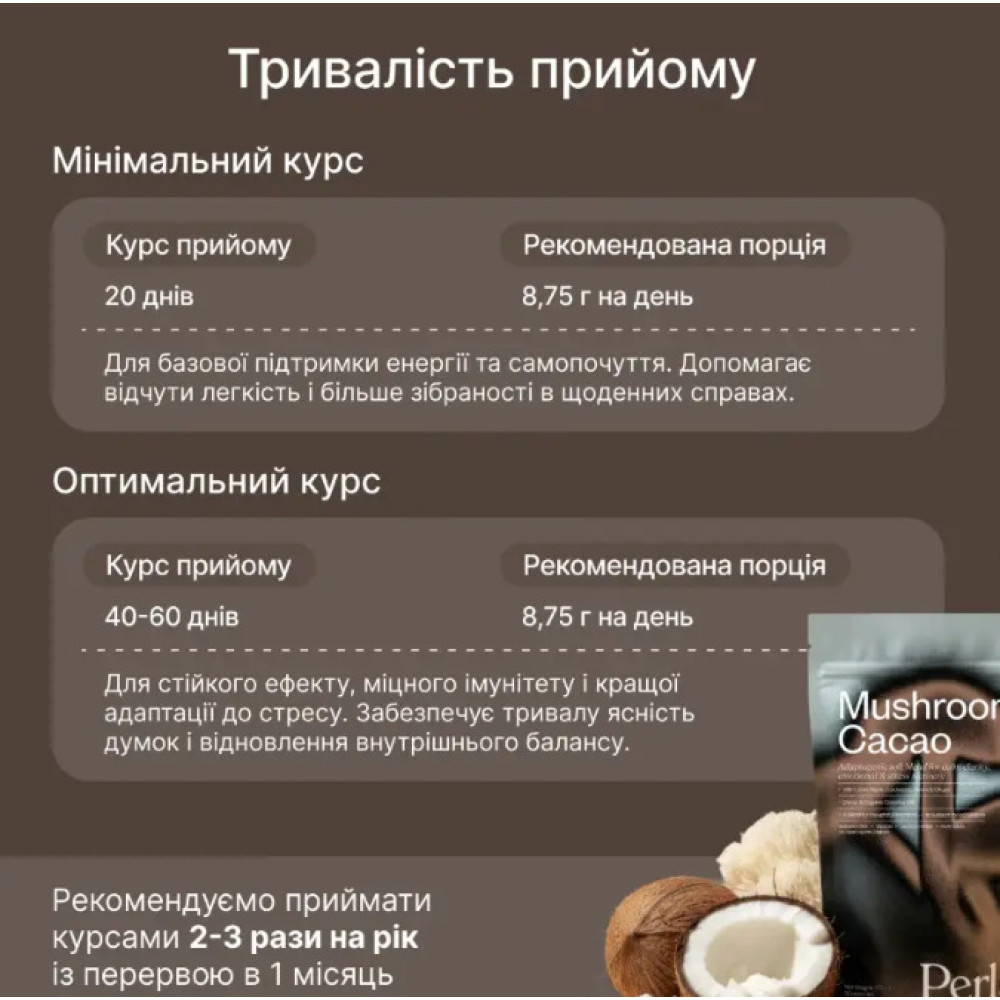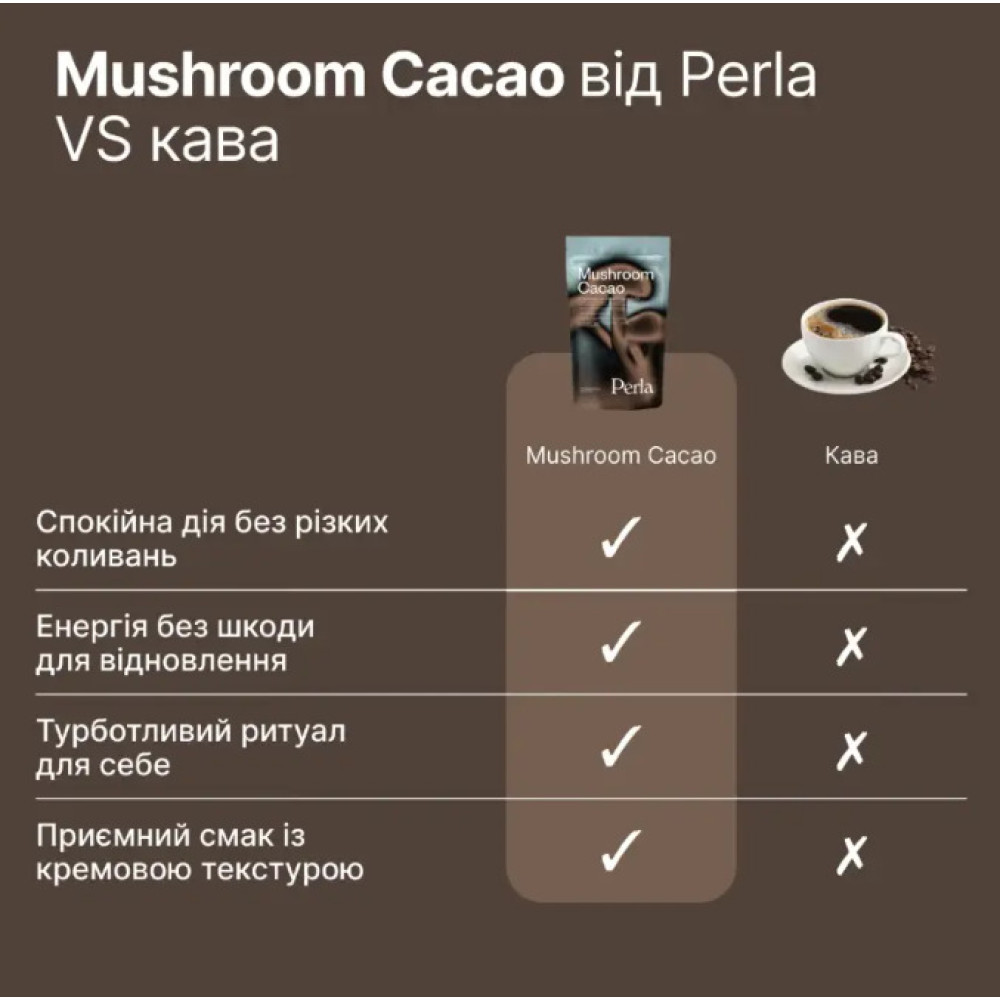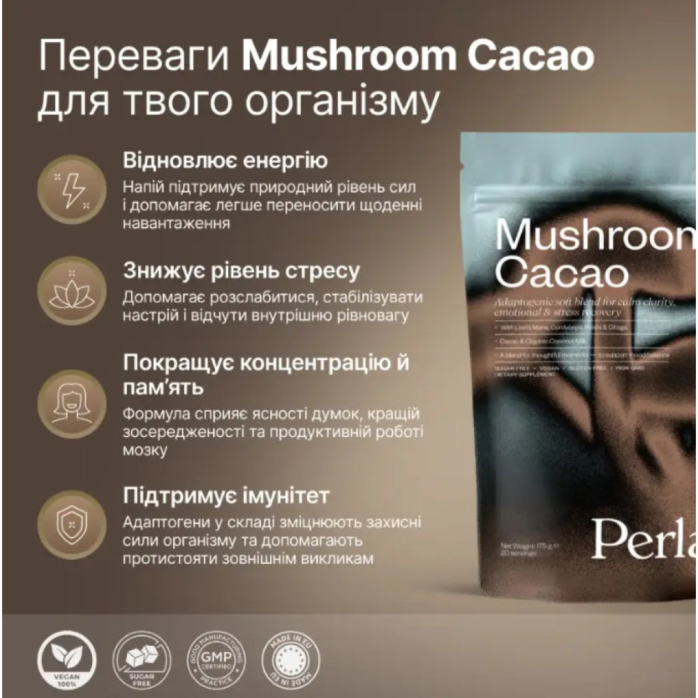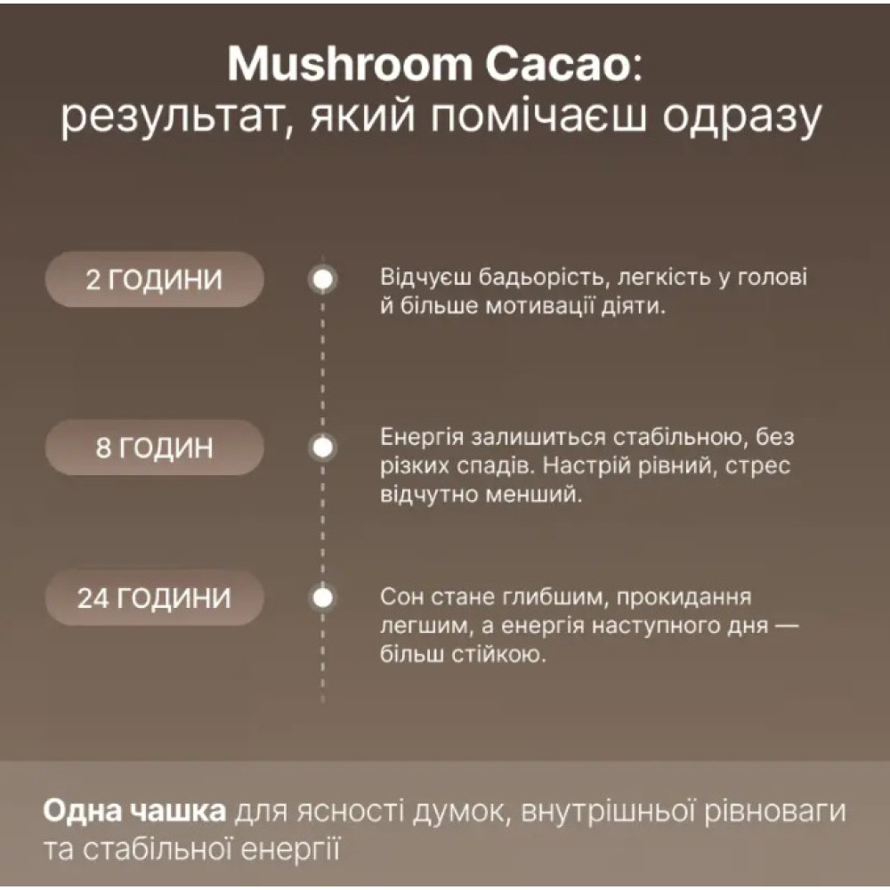 Mushroom Cacao - это функциональный какао-напиток нового поколения, который сочетает глубокий вкус натурального какао с мощным действием грибов-адаптогенов. Формула создана для мягкой энергии, сосредоточенности, поддержания иммунитета и внутреннего баланса - без кофеина, сахара или стимуляторов.