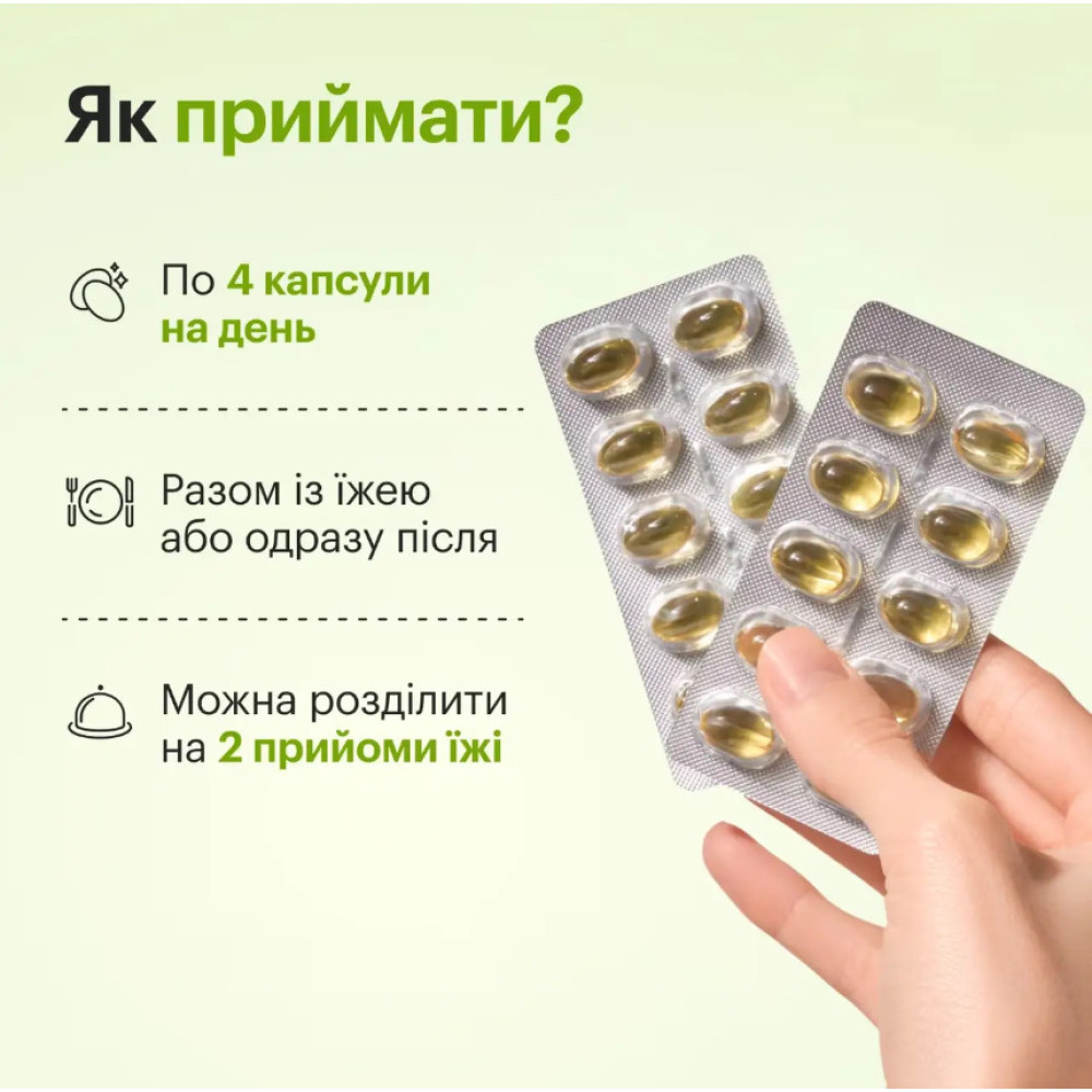 Взрослым и детям с 11 лет рекомендуем принимать по 4 капсулы в день для профилактики. Вместе с едой или сразу после, желательно с другими жирами для лучшего усвоения.