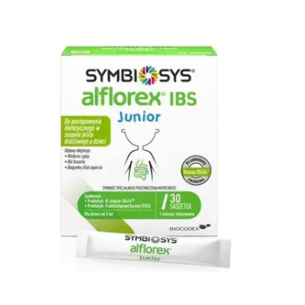 Symbiosys® Alflorex IBS Junior – это пищевой продукт для специальных медицинских целей в порошкообразных пакетиках, предназначенный для поддержания диетического режима детей старше 3 лет и облегчения симптомов синдрома раздраженного кишечника (СРК), таких как: