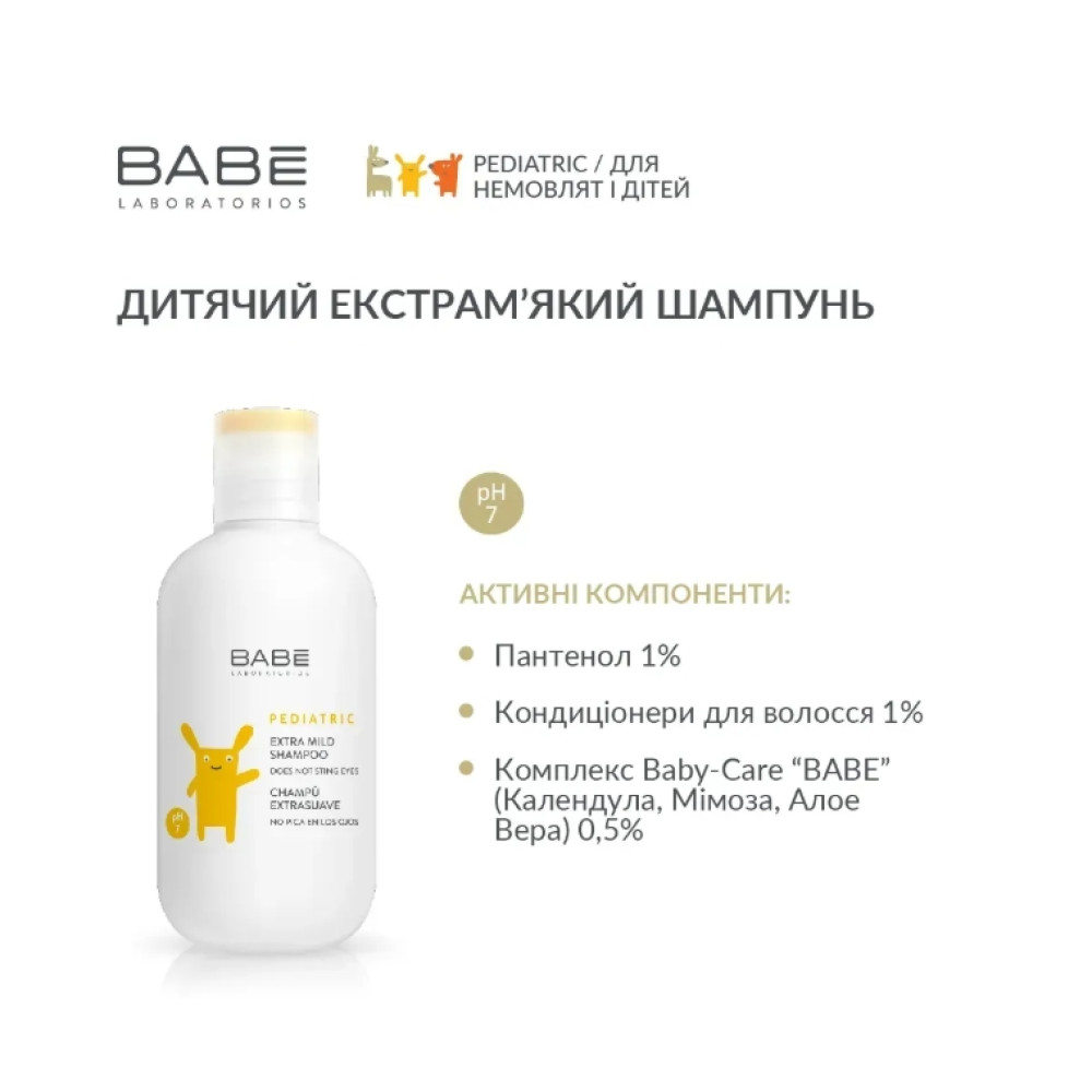 Детский экстрамякий шампунь BABE Laboratorios – гипоаллергенный, не содержит синтетических ароматизаторов и минеральных масел. Средство протестировано дерматологами и офтальмологами. Может использоваться для любого типа кожи.