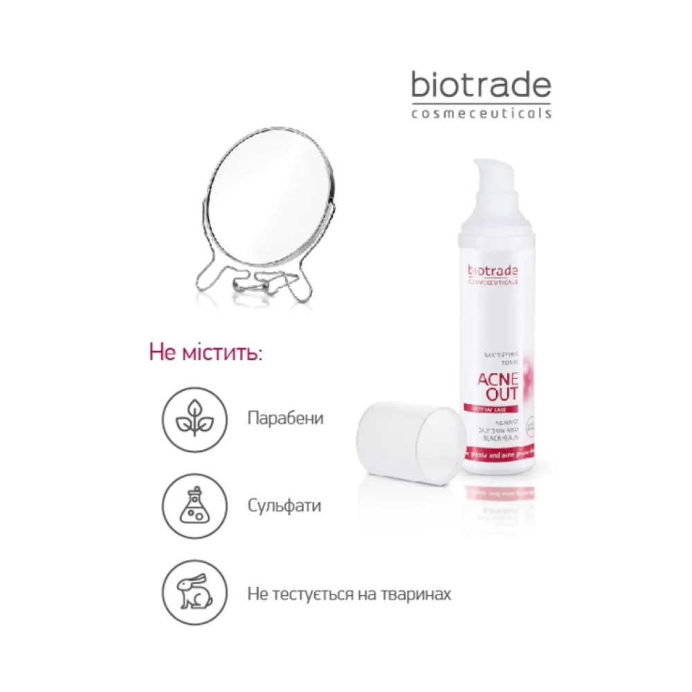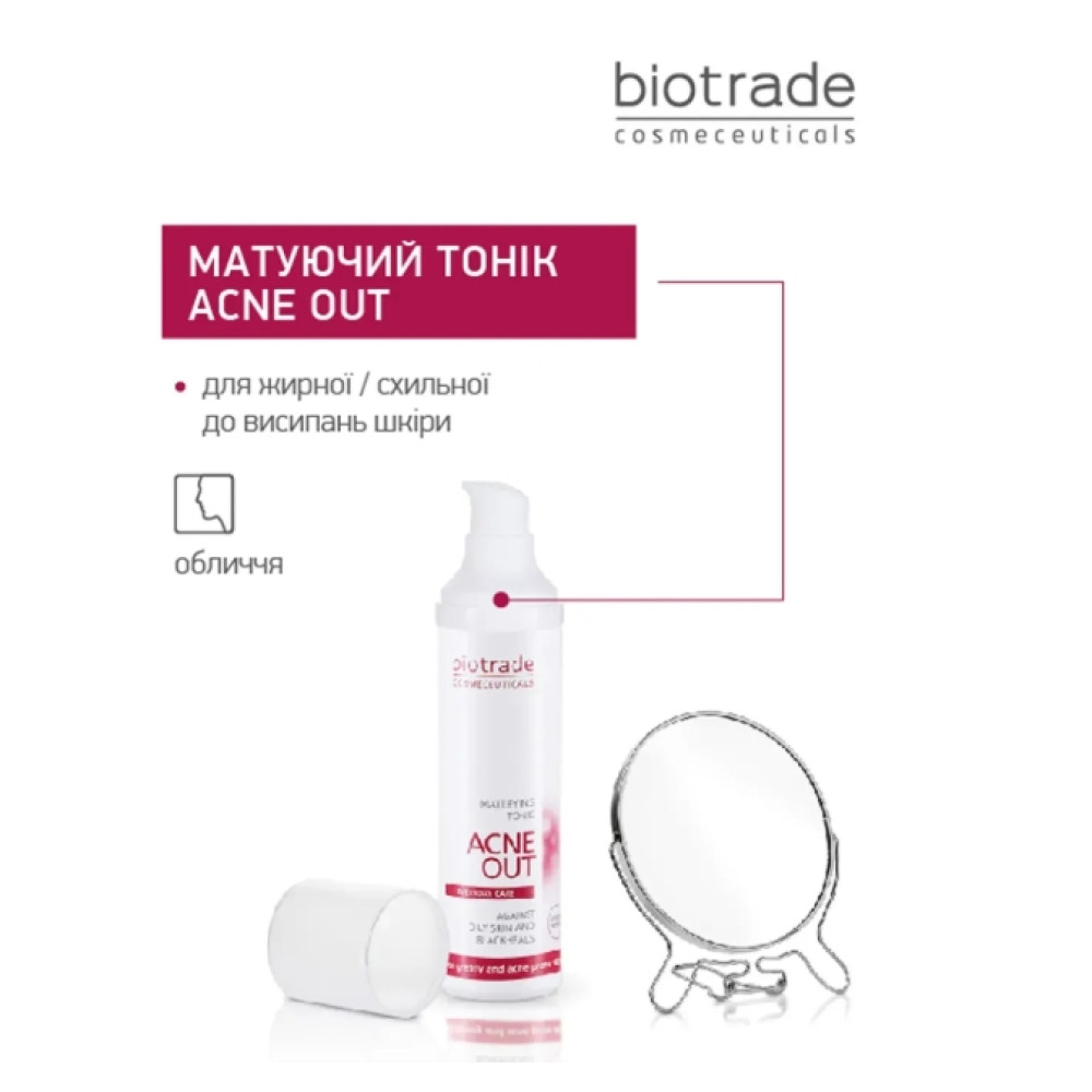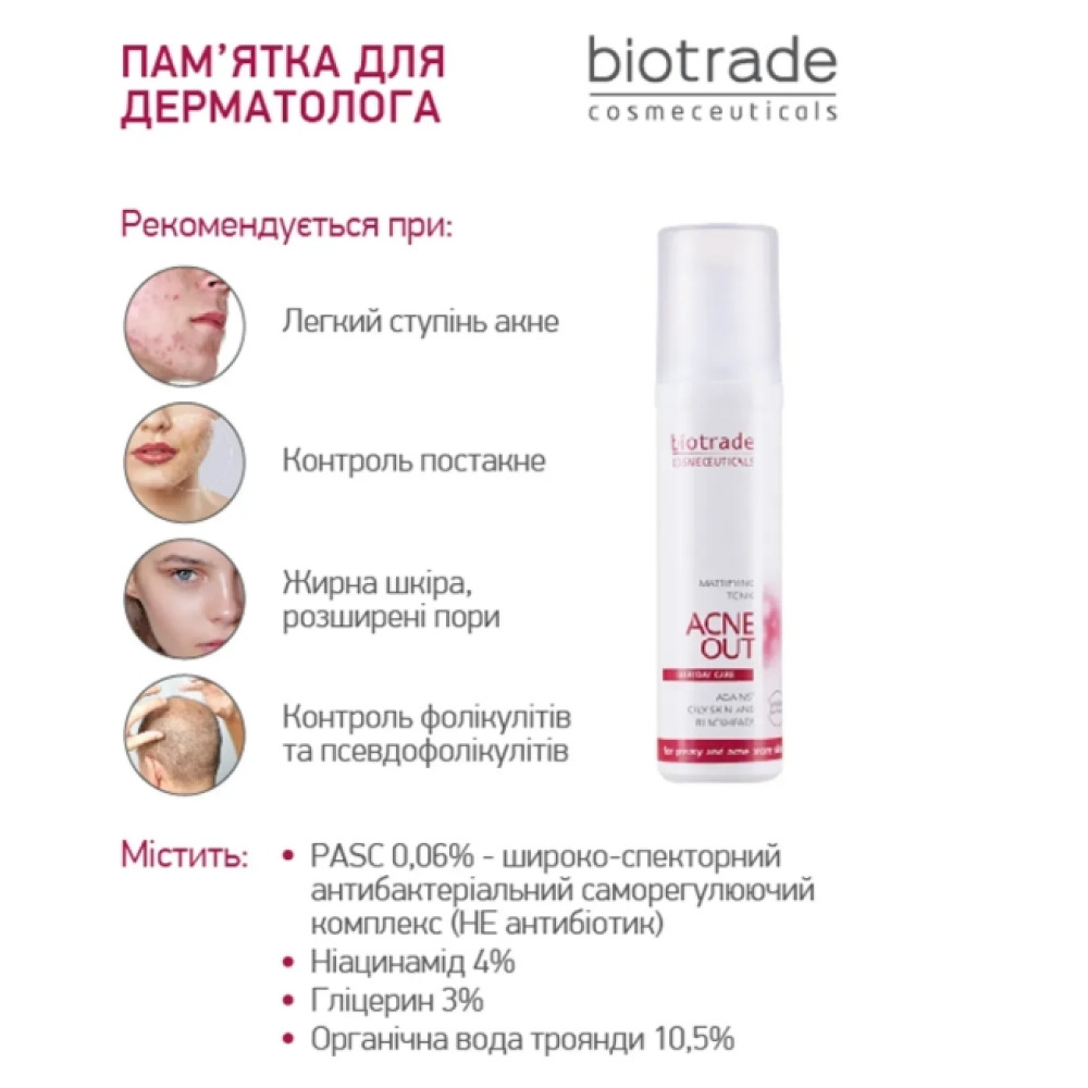 МАТУЮЧИЙ ТОНІК ДЛЯ ЖИРНОЇ ШКІРИ ТА ПРИ ЛЕГКИХ ФОРМАХ АКНЕ ACNE OUT от бренда дерматологической косметики BIOTRADE - это активный ежедневный уход за жирной и проблемной кожей, а также кожей с расширенными порами и угревой сыпи. Уникальная формула PASC оказывает антибактериальное, противовоспалительное действия, регулирует чрезмерную жирность кожи, делая кожу матовой, глубоко очищает и сужает поры, предупреждает появление новых высыпаний. Рекомендований дерматологами. Не содержит парабенов. Некомедогенный и гипоаллергенный.