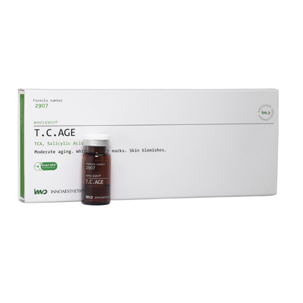 Поместите 2 мл INNO-EXFO® T.C.AGE в емкость. Ватными палочками нанесите пилинг на необходимые зоны или точку за точкой и оставьте действовать, пока не появится фрост (от 3 до 5 минут).