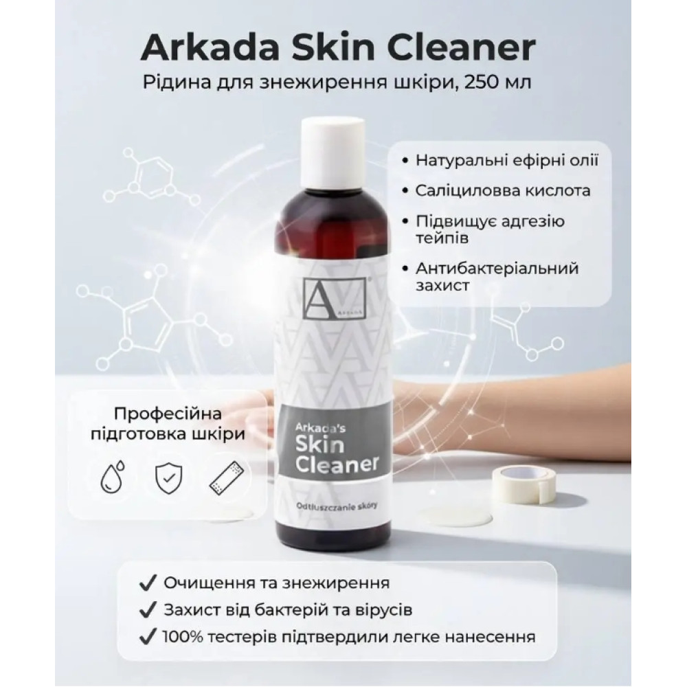 Arkada Skin Cleaner - это профессиональное средство для деликатного очищения и обезжиривания кожи, созданное на основе натуральных эфирных масел. Он эффективно удаляет загрязнения, остатки косметики и избыток себума, подготавливая кожу к дальнейшим процедурам.
