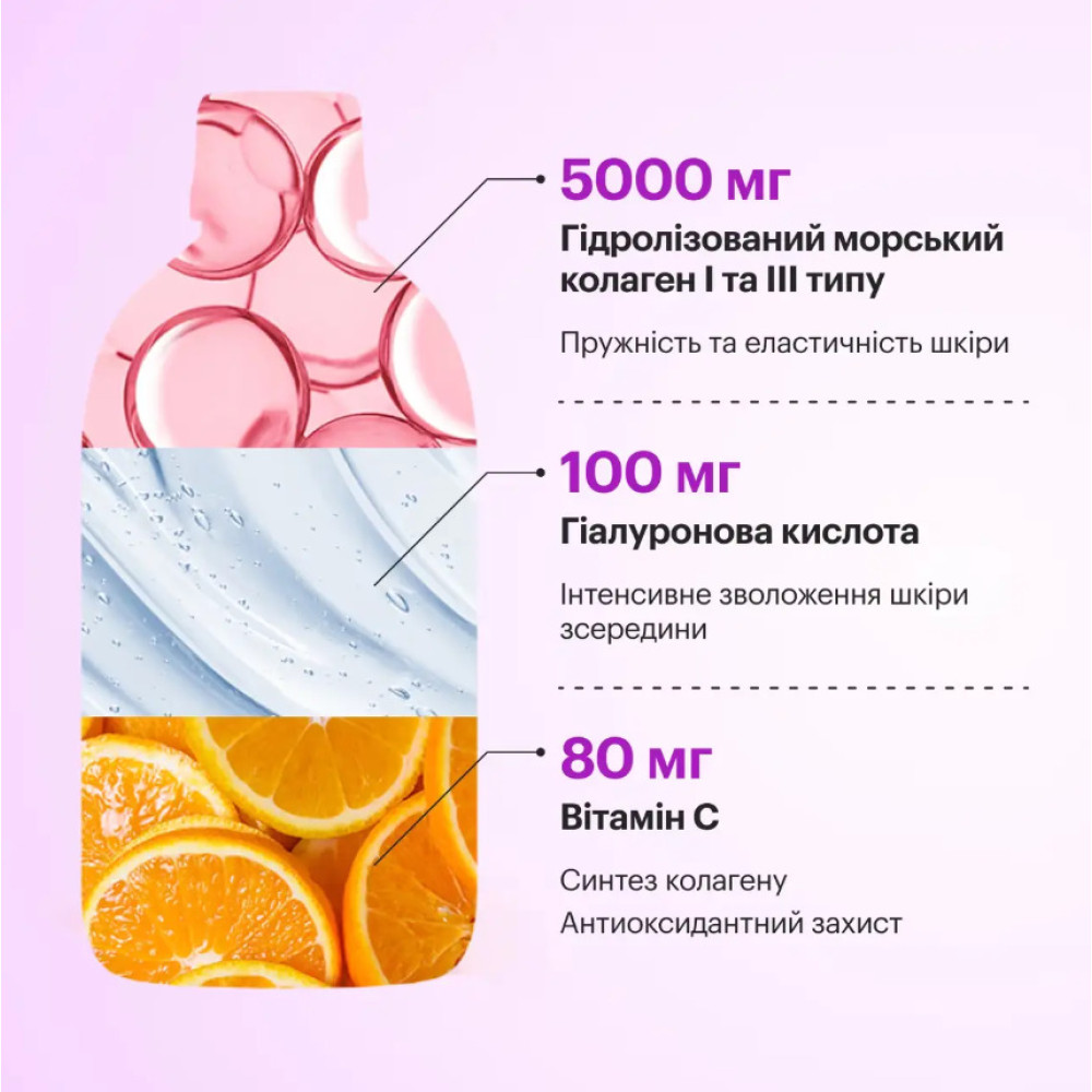 Состав: Вода очищенная, гидролизованные морские пептиды коллагена 1 и 3 типа (из рыбы), подсластитель: сорбит; L-аскорбиновая кислота (витамин С), гиалуронат натрия (гиалуроновая кислота), регулятор кислотности: лимонная кислота; натуральный ароматизатор: лесные ягоды, консерванты: сорбат калия, бензоат натрия; подсластитель: стевиол гликозиды (с стэвии).