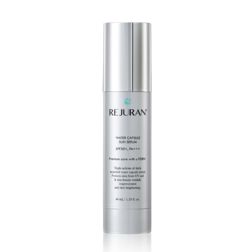 REJURAN Water Capsule Sun Serum SPF 50+ PA+++, 40 мл — сонцезахисна сироватка з гідрокапсулами, яка забезпечує високий рівень захисту від UVA та UVB променів, одночасно зволожує, живить та підтримує бар’єрні функції шкіри. Підходить для всіх типів шкіри, включно з чутливою.