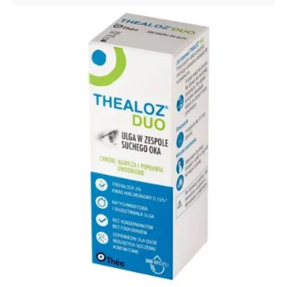 Thealoz Duo — це медичний виріб у формі очних крапель, призначений для інтенсивного зволоження, захисту та відновлення поверхні ока. Засіб допомагає усунути симптоми сухості, подразнення, печіння та дискомфорту.