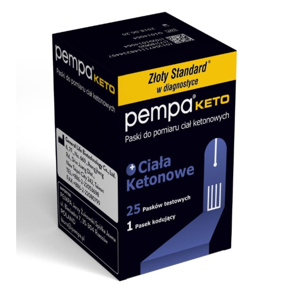 Pempa KETO тест-смужки для кетонових тіл (25 шт + 1 кодуюча смужка) — це високоточні діагностичні тест-полоски для визначення рівня кетонів у капілярній крові. Призначені для використання з глюкометром Pempa KETO 2в1 (глюкоза + кетони) та забезпечують швидкий, надійний і точний контроль кетозу в домашніх умовах.