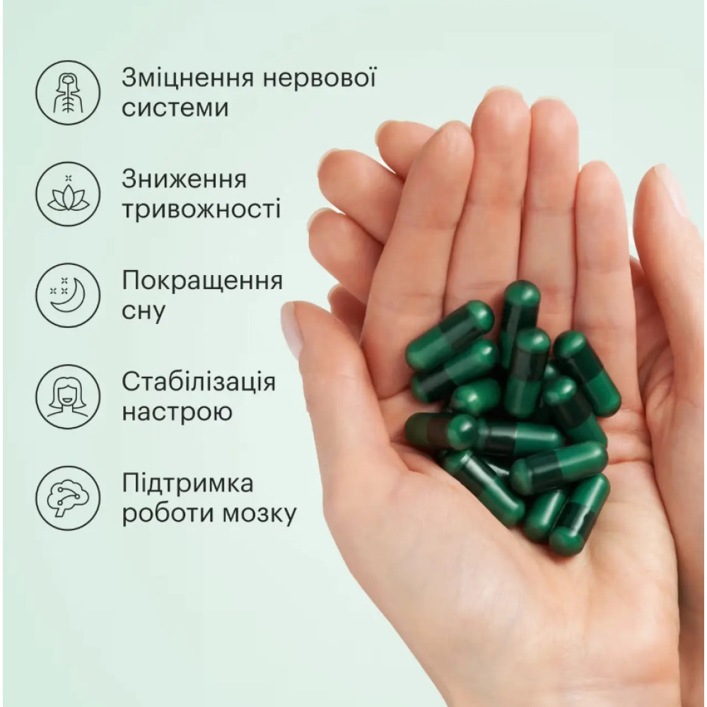 - L-theanine — унікальна амінокислота-адаптоген, яка сприяє мʼякому розслабленню, допомагає пристосуватися до стресових умов, підтримує роботу мозку та високий рівень концентрації (3).
